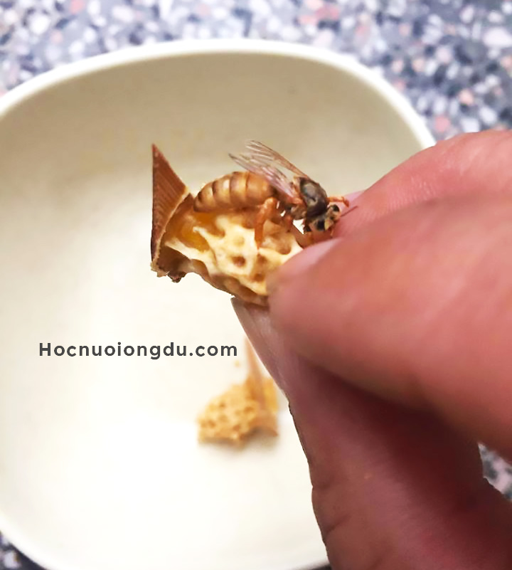 Bước 3: Đưa kim di trùng vào lỗ tổ ong, nhẹ nhàng múc phía sau lưng của ấu trùng nhỏ nhất, nhớ múc luôn phần dịch trắng bên dưới để giảm bớt "độ sát thương" cho ấu trùng.