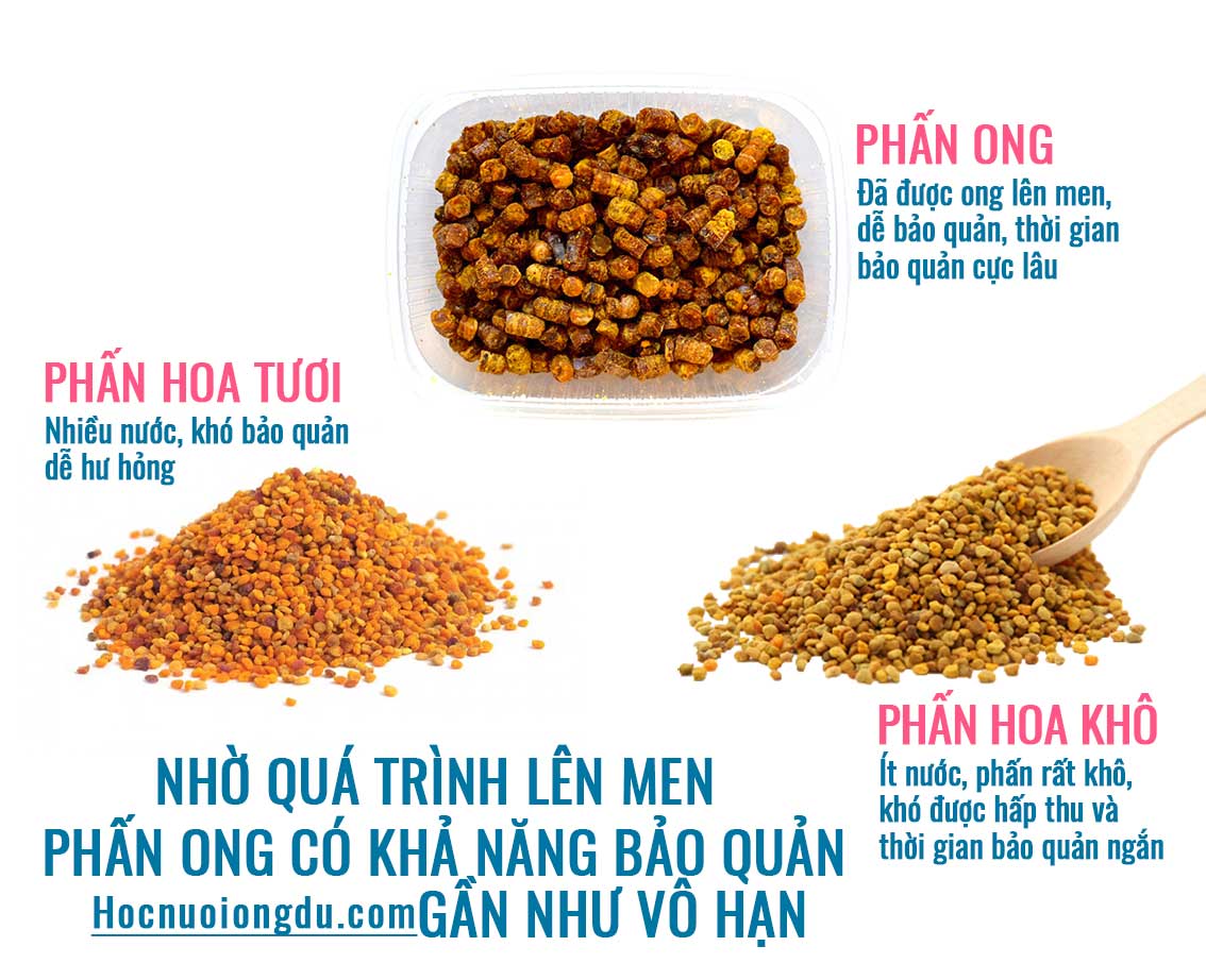 Do quá trình lên men, phấn ong có khả năng bảo quản gần như vô hạn so với phấn hoa khô hoặc đông lạnh mà ở các trạng thái này các giá trị dinh dưỡng vẫn bị mất đi nhanh chóng theo thời gian.(1), (5)